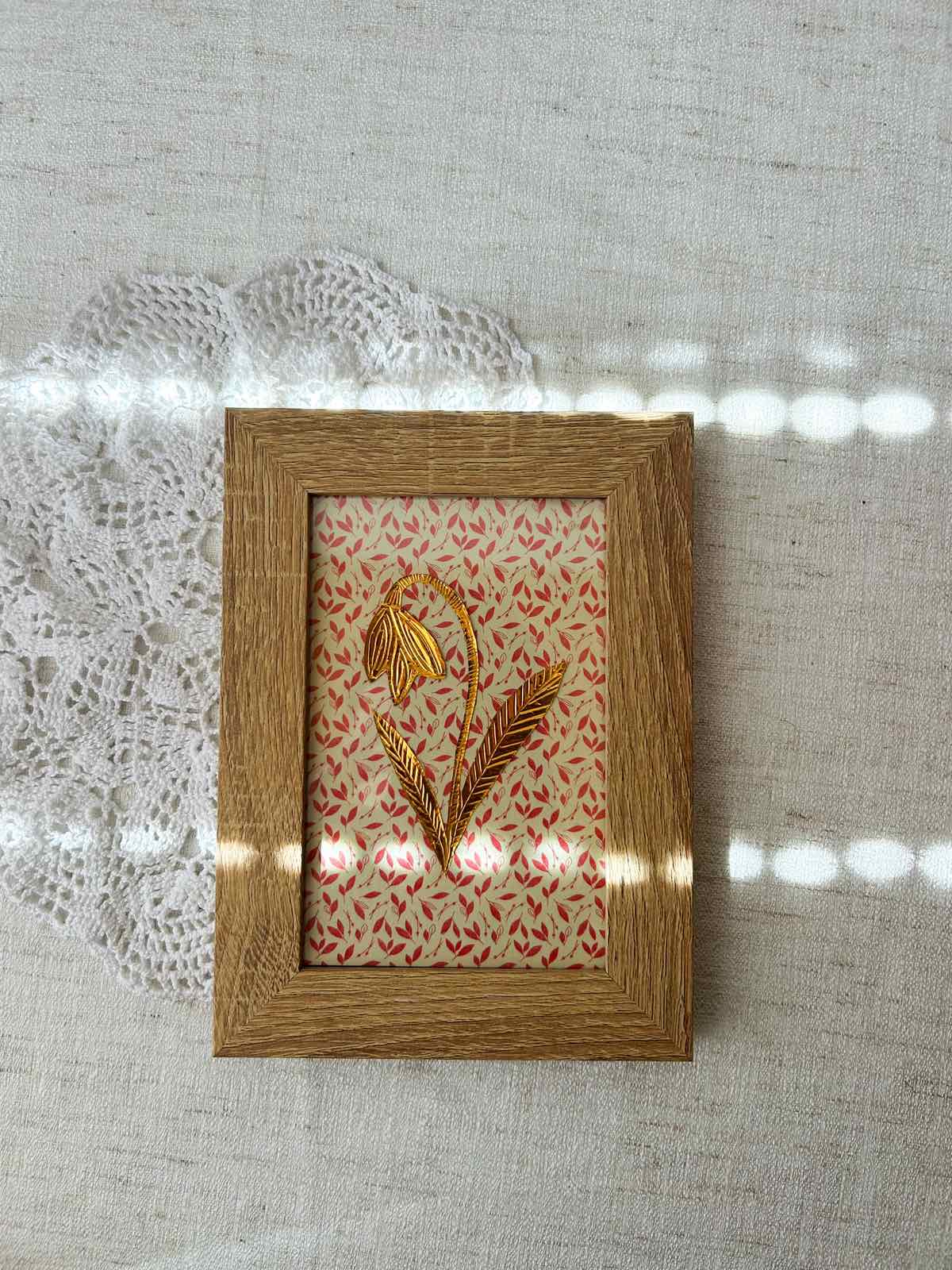 Рачно изработена фигура од алуминиумска крафт фолија врз позадина со винтиџ дизајн и врамена во декоративна рамка. Фигурата е со големина од приближно 9 см, а рамката е оригинално наменета за фотографија во формат А6.