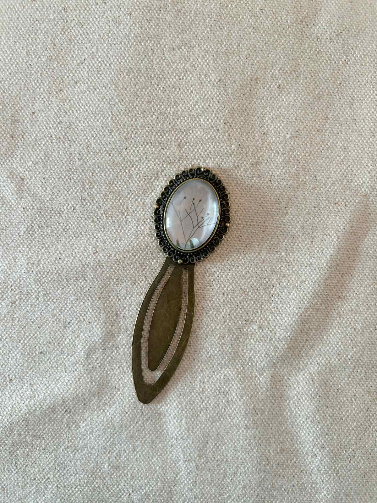 Обележувач за книга во винтиџ стил со Моки илустрација зад стакленцето. Материјал: Метал во бронзена нијанса, акрилно стакленце Големина: 8см