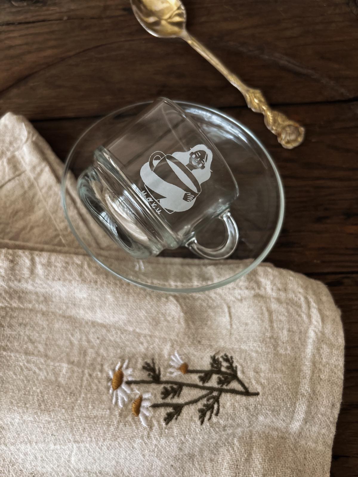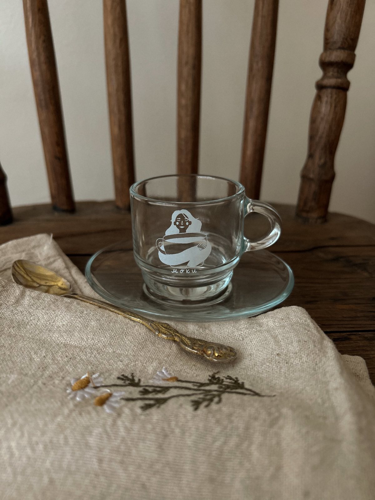 Илустриран стаклен филџан за еспресо (80 мл) со тацна
