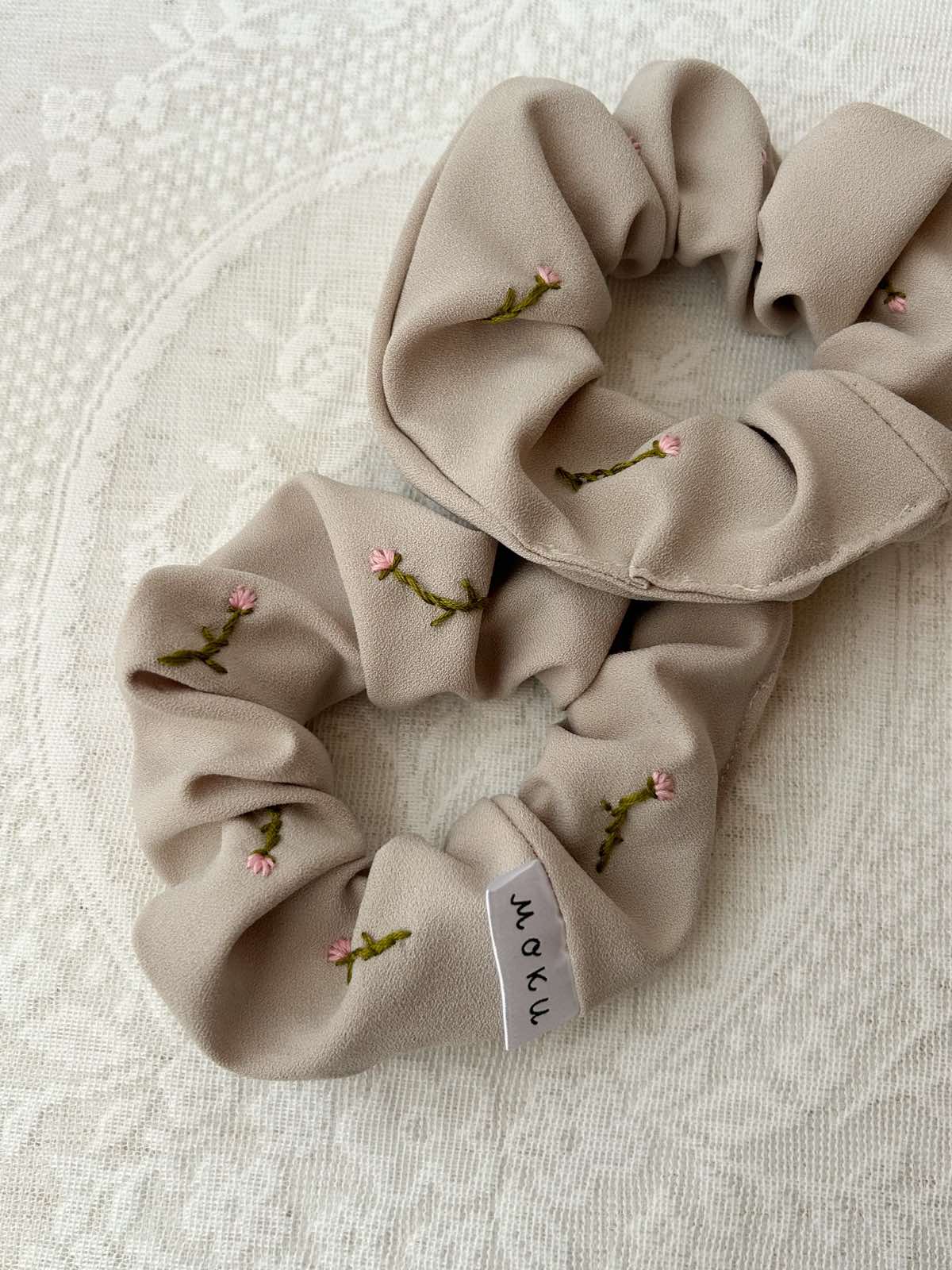 Рачно изработен стегач за коса од текстил, со нежен рачен вез.