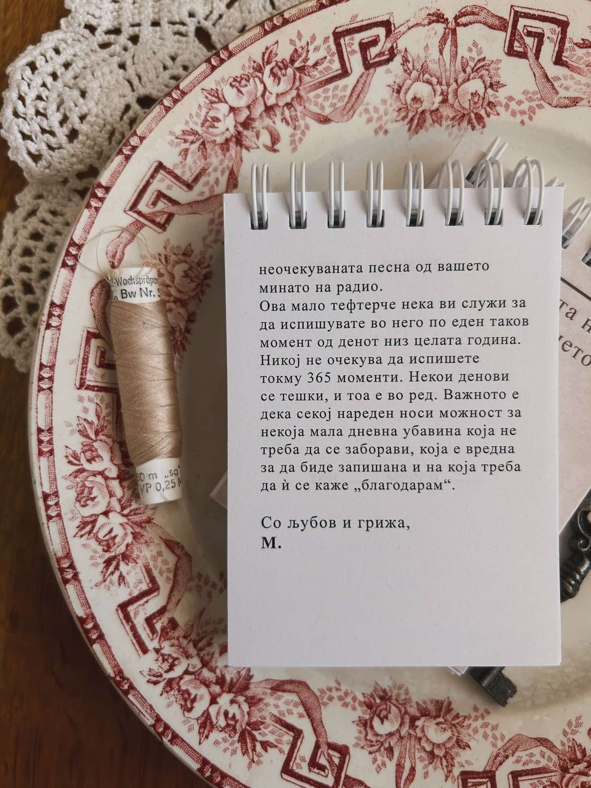 Не мора секој ден да имате што да запишете, ниту да стигнете до 365 моменти. Важно е да ја забележите убавината во секој нареден ден и тивко да ѝ кажете „благодарам“.